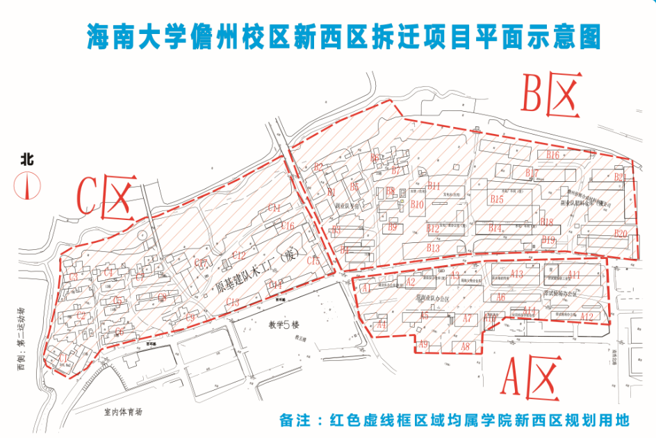 为加快落实省委、省政府建设“最美校园”的工作要求,将热带农林学院建设成“国内一流、国际知名”学院,经学校研究,决定在新西区规划建设新的教学楼群,该楼群将在2017年9月1日投入使用。时间十分紧迫,为确保工期顺利进行,必须抓紧对该区(A/B/C区详见附图)内相关房屋及地上物件进行拆除。请该区域内相关住户积极支持和配合学校建设,在2016年9月15日前完成搬迁撤离。